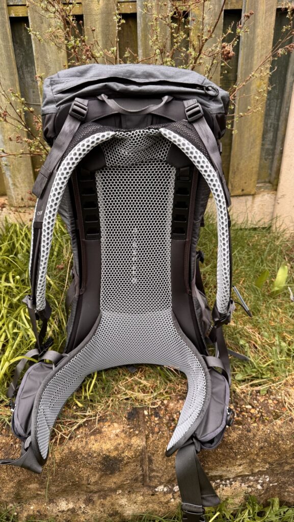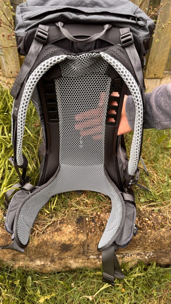 Instead of foam sitting against your back, there’s a tensioned mesh panel suspended over a LightWire frame. That gap improves airflow and reduces the sweaty-back feeling on longer hikes.